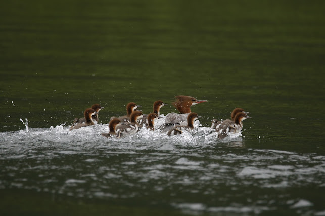 Hen Common Merganser and her brood of ducklings scooting across Eyak River as our airboat glides back to the launch.